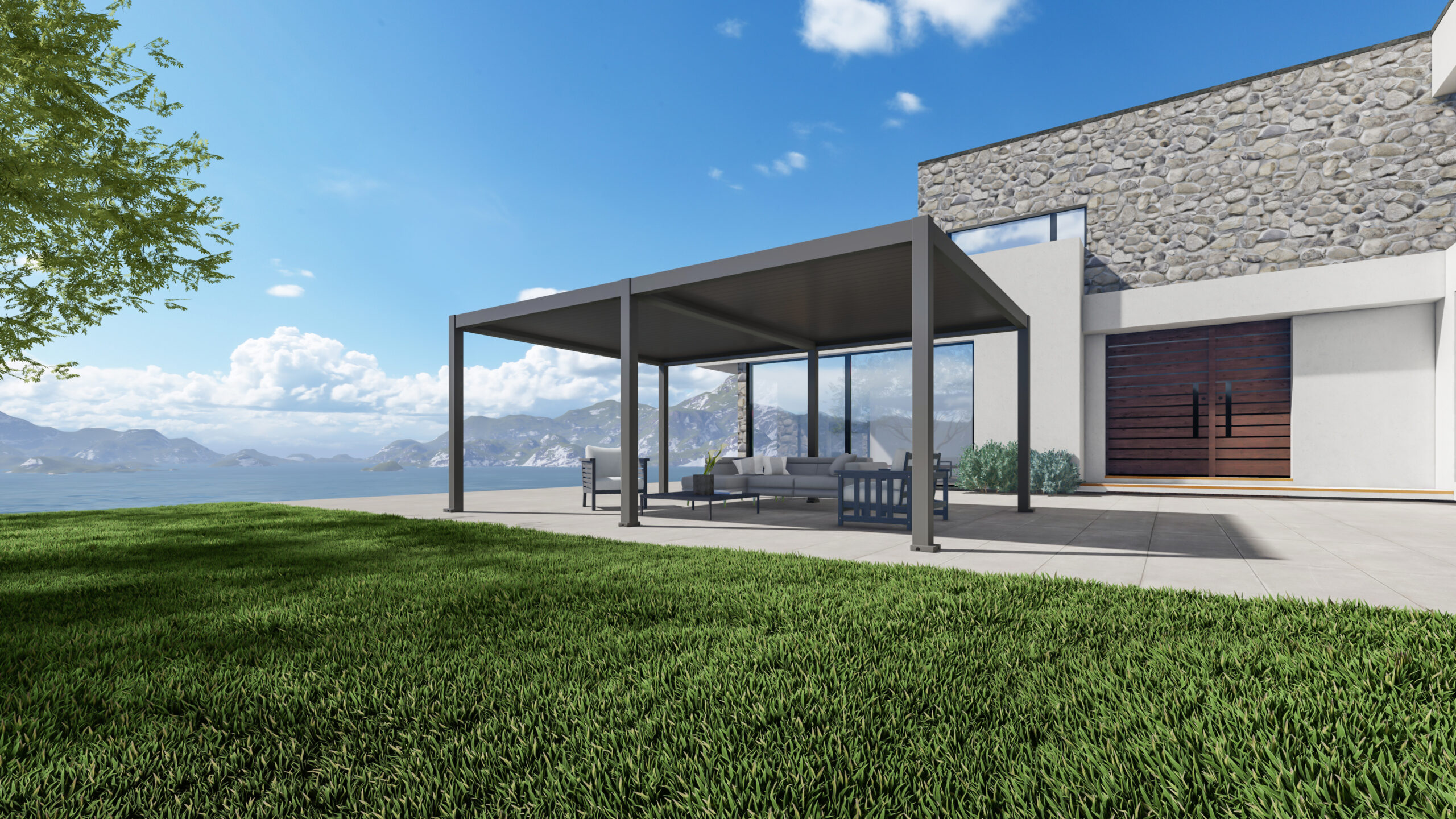 Bioklimatske pergole Bellano iz prašno barvanega aluminija z nastavljivimi lamelami. Udobje in senčenje na prostem – v dimenzijah in barvah po meri.