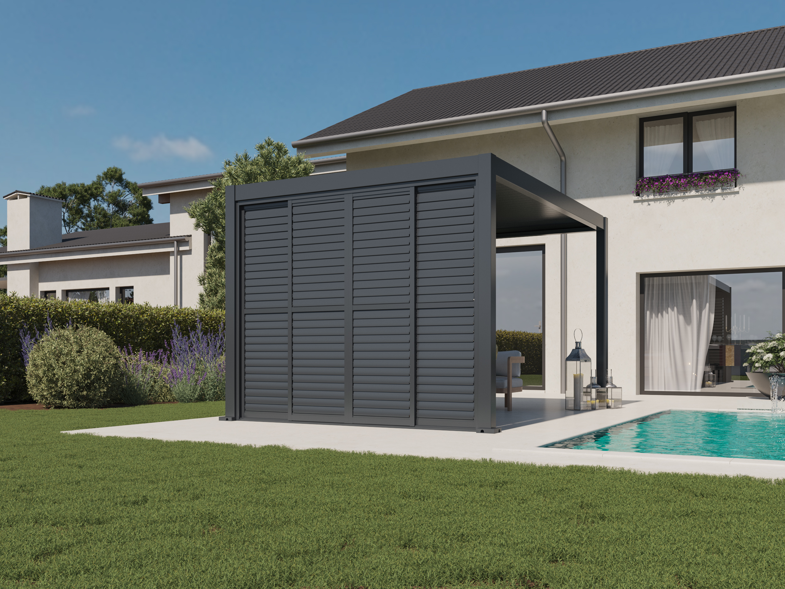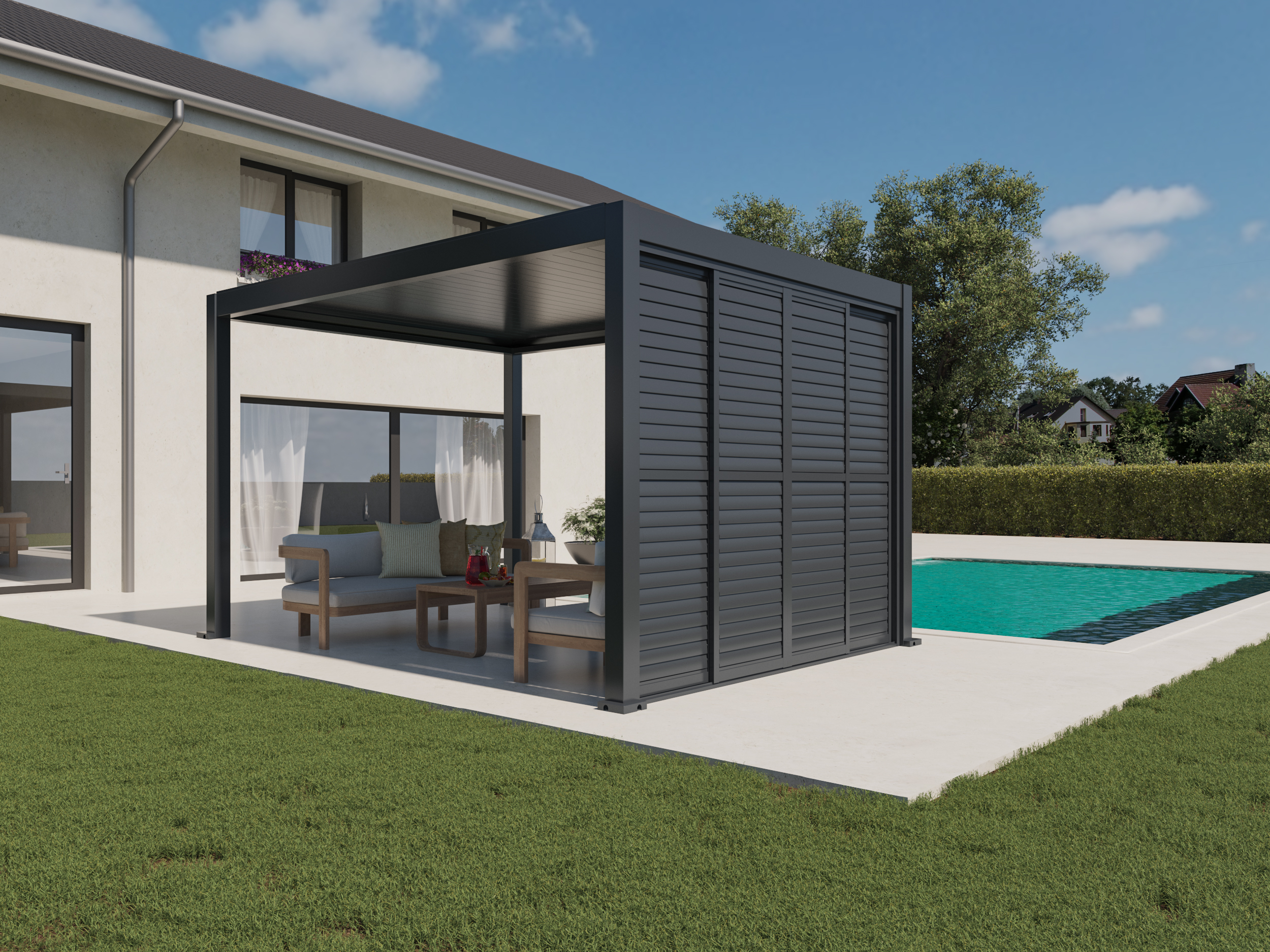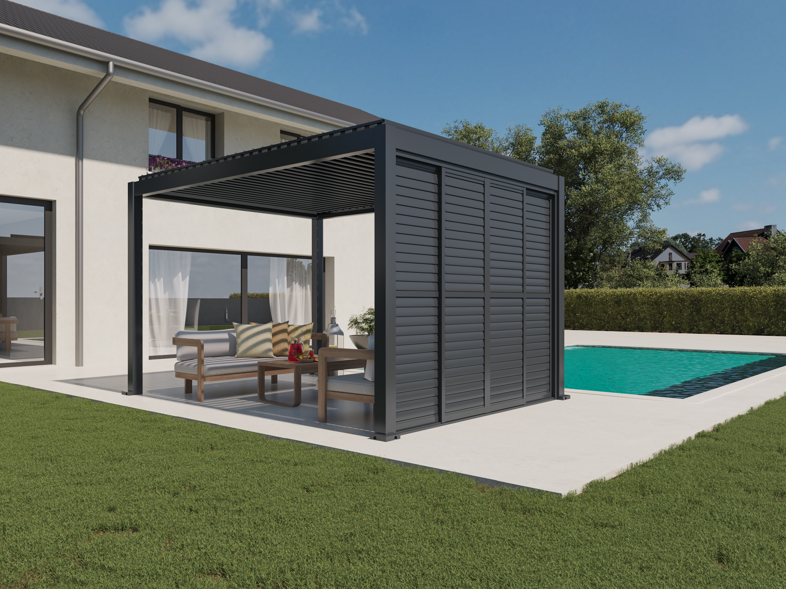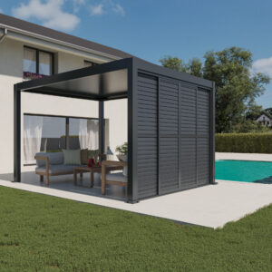 Sustav omogućuje vodoravno klizanje panela i neovisno podešavanje kuta lamela gore i dolje, što omogućuje preciznu regulaciju svjetlosti, privatnosti i protoka zraka – u svakom trenutku i pri svim vremenskim uvjetima. Zahvaljujući elegantnom dizajnu i vrhunskim materijalima, klizna stijena savršen je izbor za moderne pergole i vanjske prostore.