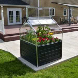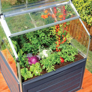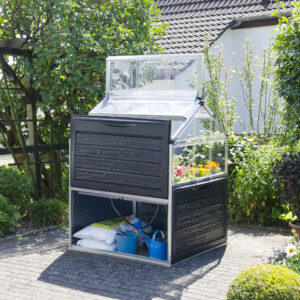 Visoka greda dim 116 x 118 x 148 cm, 4 x odvod odvečne vode in polico za shranjevanje spodaj. Alternativa rastlinjakom, za majhne prostore, balkone, balkone v več stanovanjskih stavbah ter terase in vikend hiške.