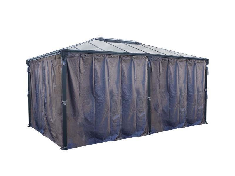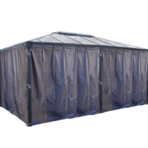Komplet zaves je estetsko prijeten in funkcionalen. Omogoča vam zasebnost, ki jo iščete in cenite. Zasnovan je tako, da je združljiv z vašo strukturo paviljona. Zavese imajo kavlje, ki nato zdrsnejo v obešala vašega paviljona. Ta komplet vsebuje štiri zavese, ki bodo pokrivale celoten paviljon. Enostaven za namestitev in enostaven za uporabo. Ta komplet vključuje zadrge za povezavo zaves in zadrge za pritrditev na vogalne stebre. Vzdrževanje ni potrebno, preprosto jih lahko operete v stroju. Iz močnega poliestra, nepremočljive in lahke.